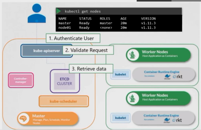 api-server收到请求,对用户进行验证,调用本地/etc/.kube/config文件,如果验证不通过,拒绝用户访问(报403,promising deny);验证通过后,对用户命令(验证命令格式、参数)进行验证