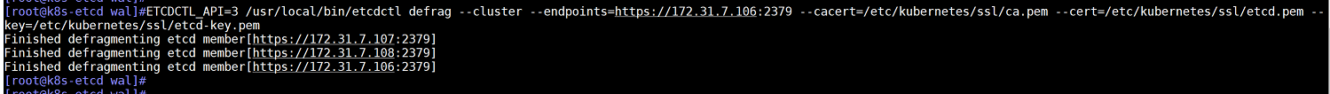 ETCDCTL_API=3 /usr/local/bin/etcdctl defrag --cluster --endpoints=https://172.31.7.106:2379 --cacert=/etc/kubernetes/ssl/ca.pem --cert=/etc/kubernetes/ssl/etcd.pem --key=/etc/kubernetes/ssl/etcd-key.pem