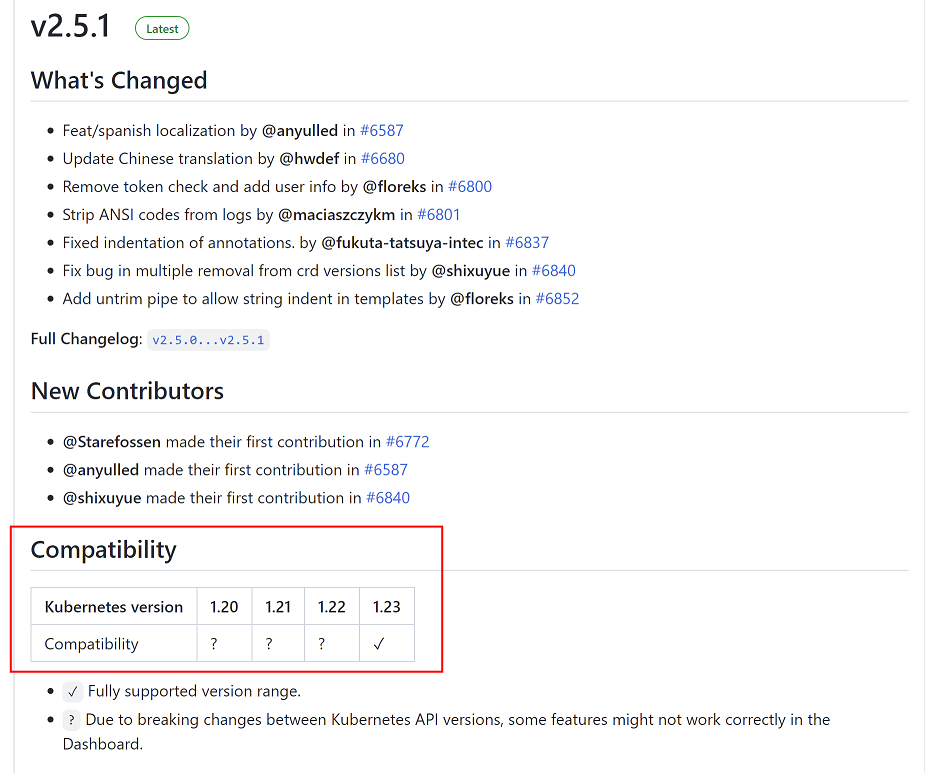 注意:官方dashboard和K8S版本有兼容问题,在部署之前要先查看k8s集群版本是否和dashboard完全兼容,如下图所示,dashboard v2.5.1兼容k8s 1.23之前的版本,超过该版本则存在兼容性问题,部分功能可能不支持,部署时需要注意