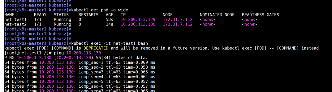 kubectl exec -it net-test1 -c container2 bash -n default #这里container2是指pod net-test1中第2个容器