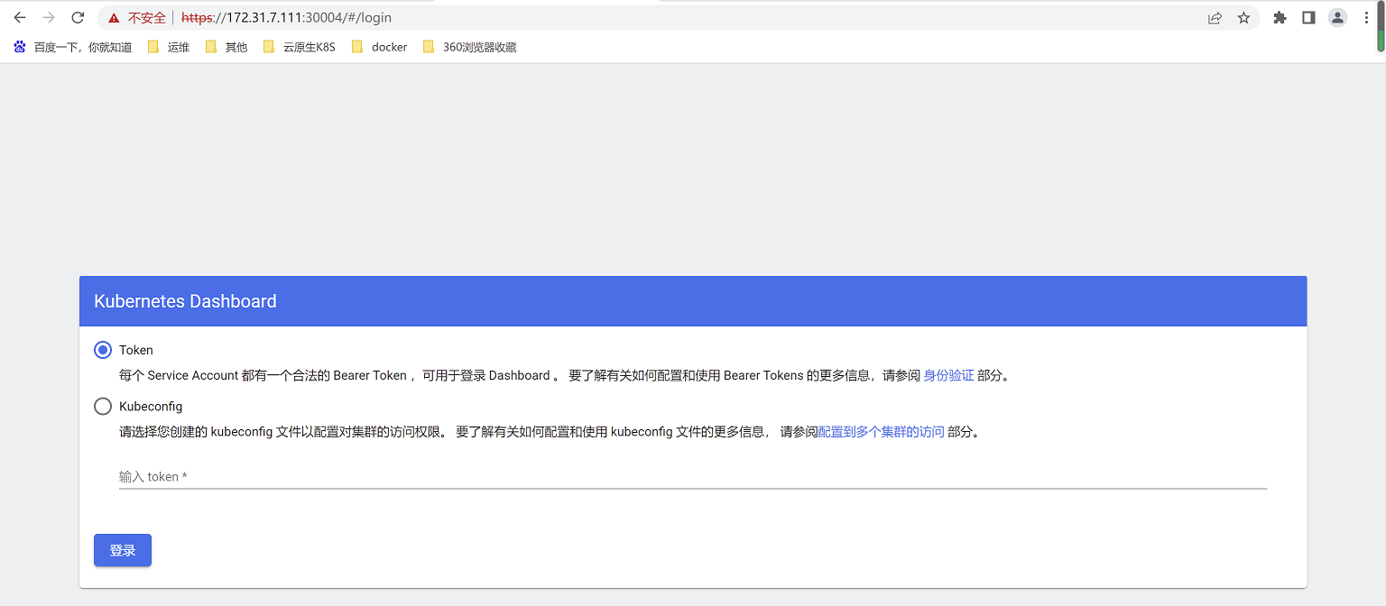 2、访问集群内任一节点的30004端口,这里以node1节点为例:即https://172.31.7.111:30004(注意要用https)