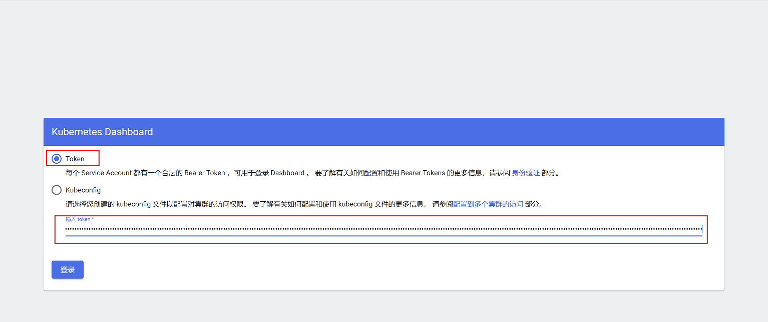 4、复制查询到的token,然后再dashboard登录页面输入token,即可登录