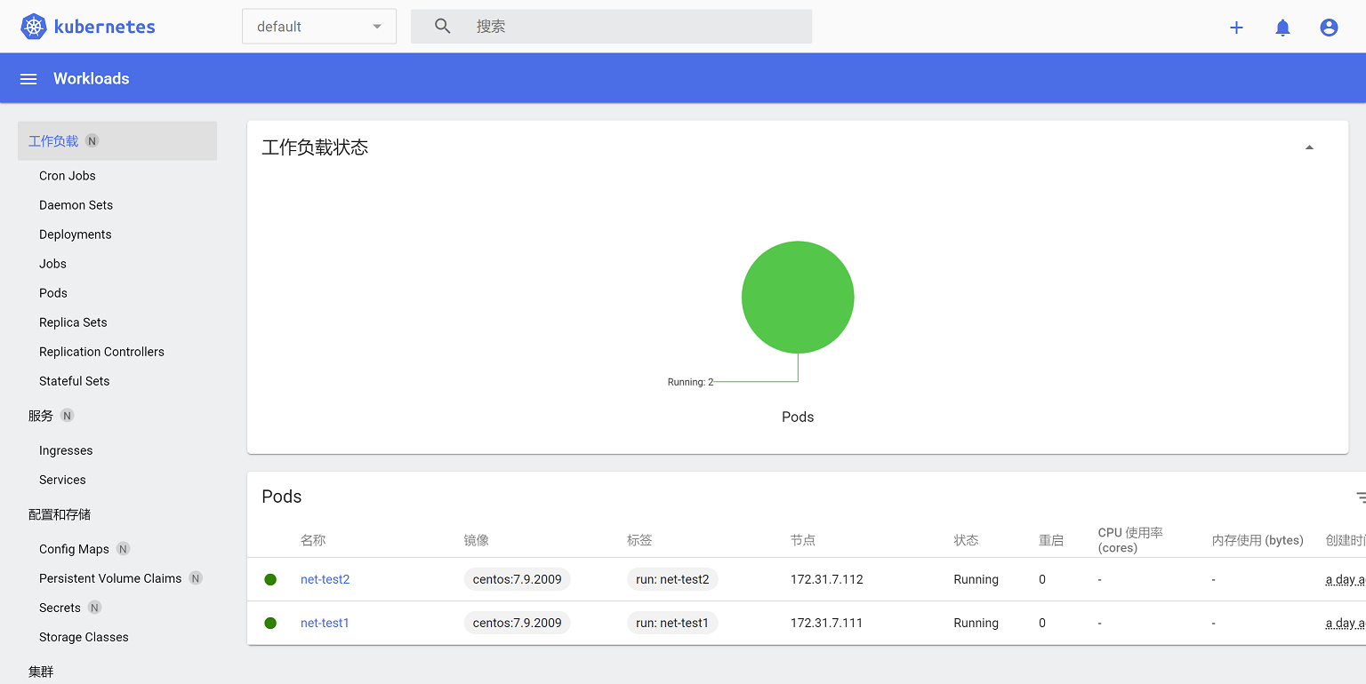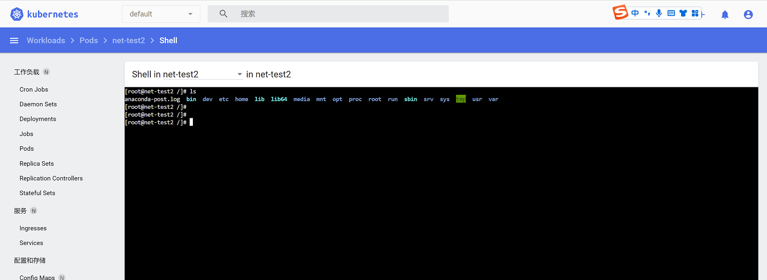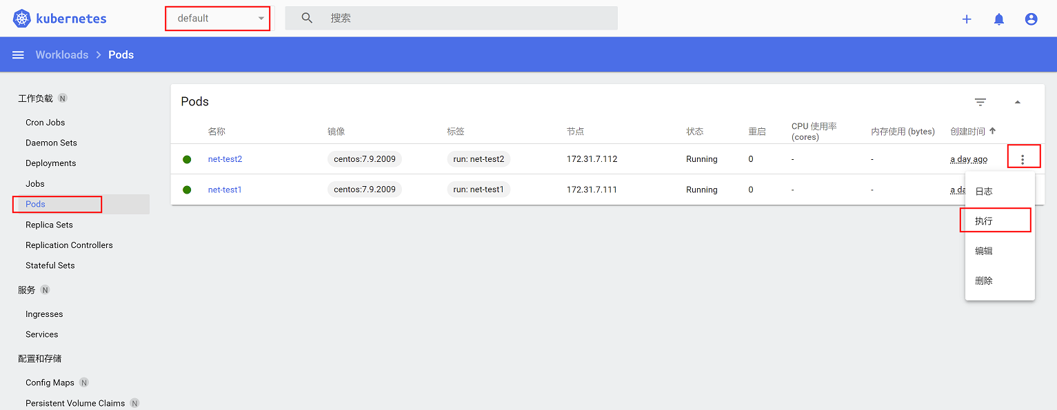 切换到default namespace,查看pod,有net-test1和net-test2,点击容器的三个点,选择执行