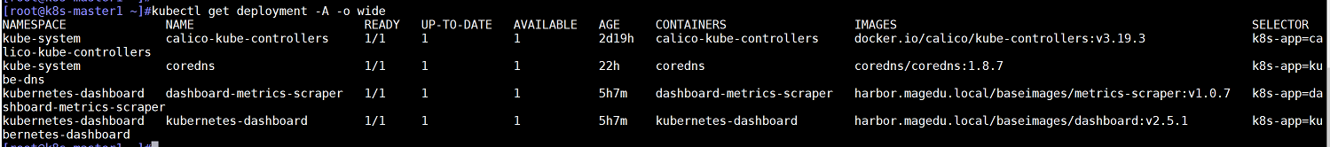 kubectl get deployment -A -o wide #更改显示格式,这里的-o wide是指以延展格式显示,能够显示更多的信息