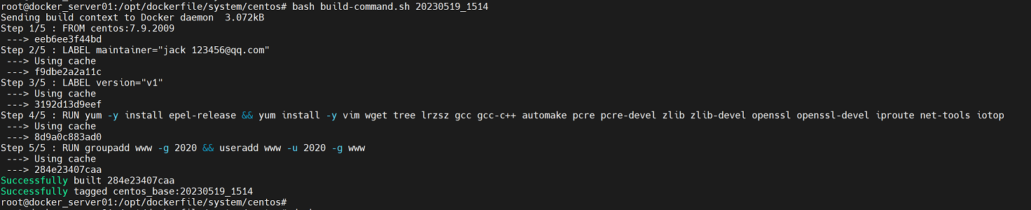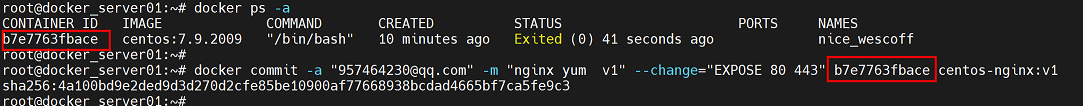 root@docker_server01:~# docker commit -a "957464230@qq.com" -m "nginx yum v1" --change="EXPOSE 80 443" b7e7763fbace centos-nginx:v1       # b7e7763fbace是指上一步获取到的容id