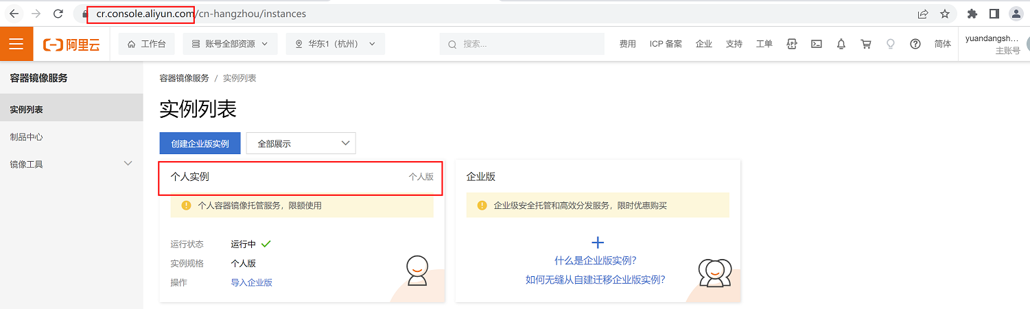 1、登录阿里云镜像仓库,注册账号后进入以下页面,点击右侧个人实例