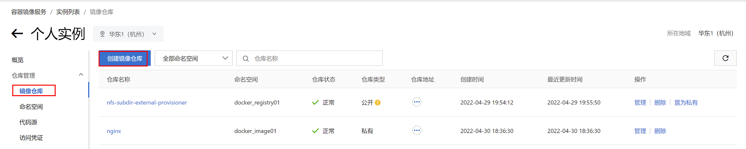 3、创建镜像仓库,这里的镜像仓库是指哪个应用,如:nginx、tomcat等