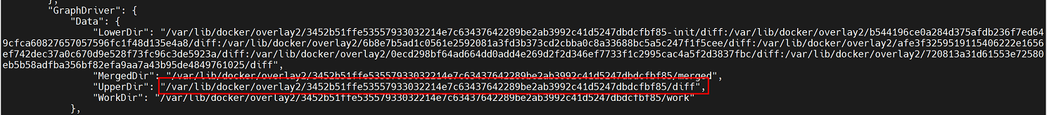 其中UpperDir 的路径/var/lib/docker/overlay2/3452b51ffe53557933032214e7c63437642289be2ab3992c41d5247dbdcfbf85/diff是指差异数据,容器中产生的差异数据都会保存在该目录下。容器创建以后增加的数据都会保存在该目录下