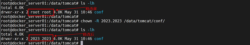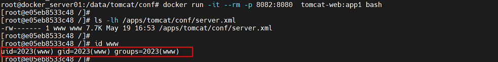 (1)先进入容器查看容器默认server.xml文件属主的用户id,这里server.xml的属主www,id为2023