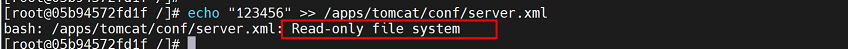 [root@630275bdc859 /]# echo "testweb app v3" > /data/tomcat/webapps/testapp/index.html   #向该文件写入数据,会提示该文件是只读文件,无法写入
