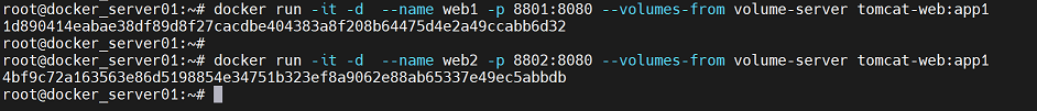 root@docker_server01:~# docker run -it -d --name web2 -p 8802:8080 --volumes-from volume-server tomcat-web:app1