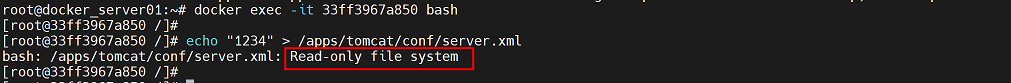 root@docker_server01:~# docker run -it -d --name volume-server -v /data/testapp/:/data/tomcat/webapps/testapp -v /data/tomcat/conf/server.xml:/apps/tomcat/conf/server.xml:ro tomcat-web:app1