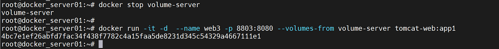 root@docker_server01:~# docker run -it -d --name web3 -p 8803:8080 --volumes-from volume-server tomcat-web:app1