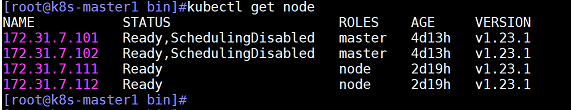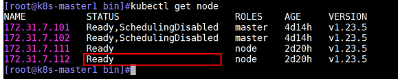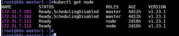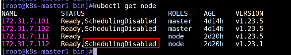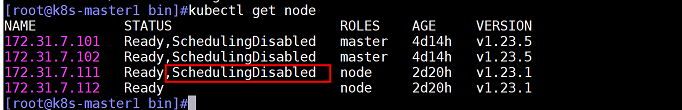 查看node1(172.31.7.111)节点状态,处于不可调度状态