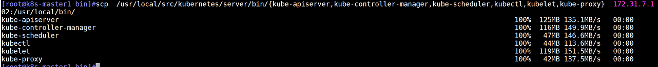 scp /usr/local/src/kubernetes/server/bin/{kube-apiserver,kube-controller-manager,kube-scheduler,kubectl,kubelet,kube-proxy} 172.31.7.102:/usr/local/bin/