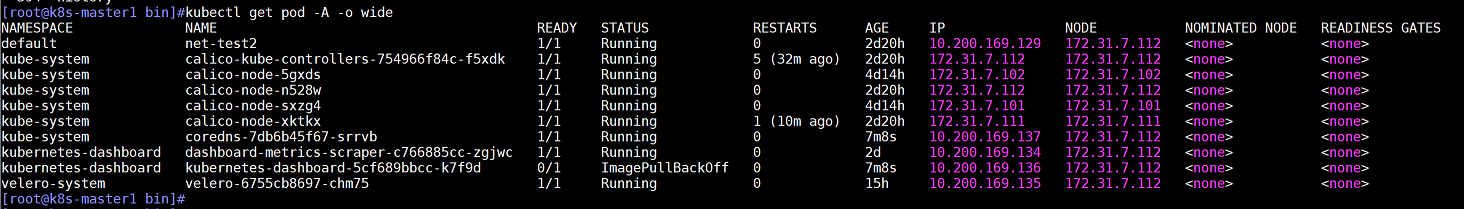 注意:此时node2上存在的容器均是deployment创建的容器,不是deployment创建的容器会不存在(如default namespace下的net-test1和myserver namespace下的nginx)