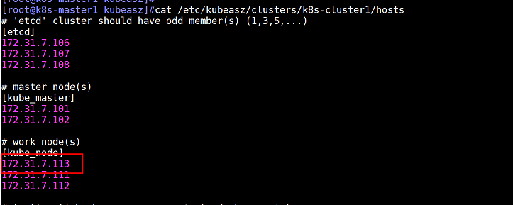 查看/etc/kubeasz/clusters/k8s-cluster1/hosts文件,发现172.31.7.113已经被自动添加到kube_node字段中