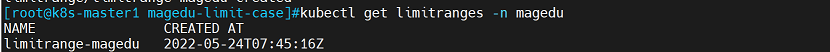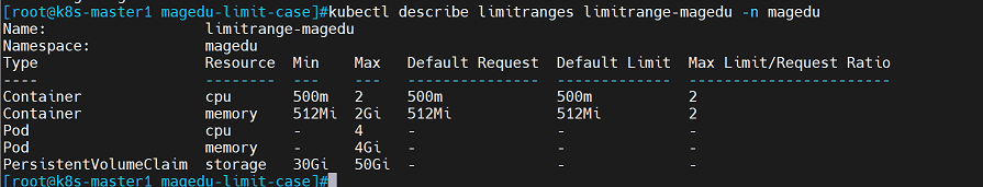 limits.memory: 4Gi   #指定magedu namespace中pod可使用的内存limits值