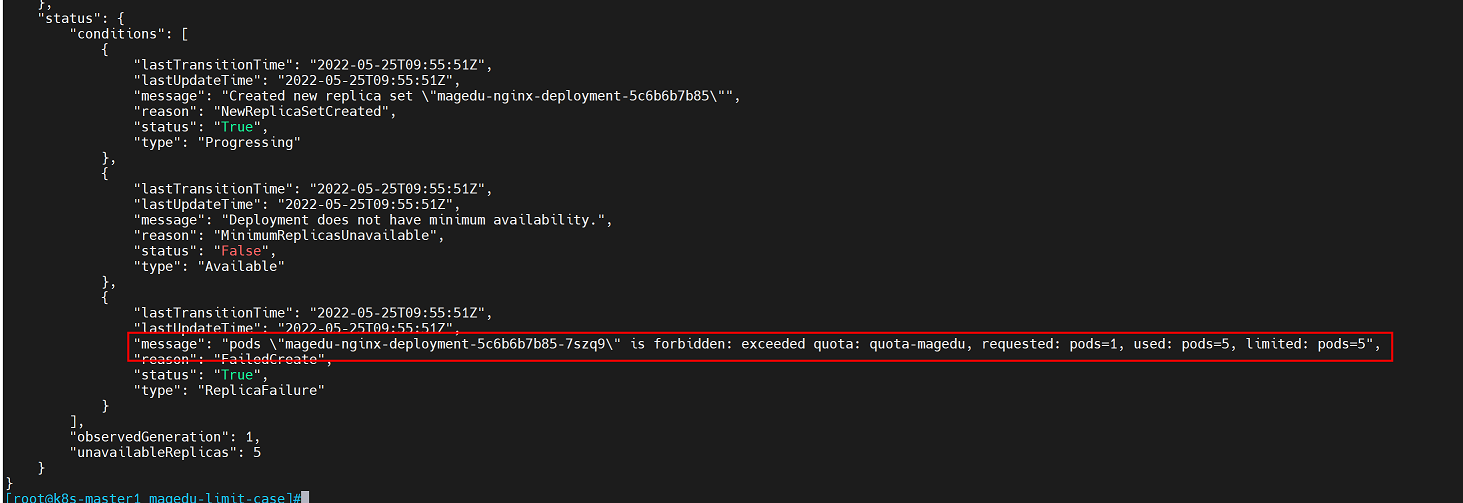 pods: "5"   #指定magedu namespace中可创建的pod总数