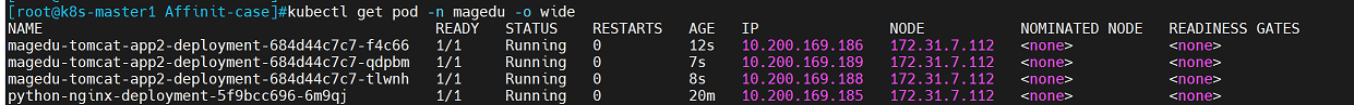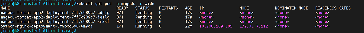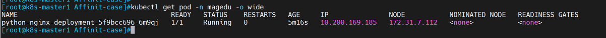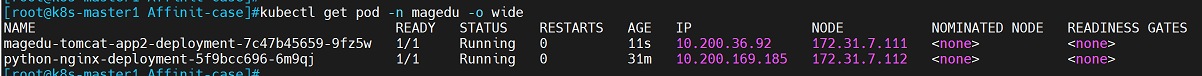 创建pod,查看调度结果,有pod被调度至172.31.7.111(已经被打上污点)上,说明容忍配置已经生效