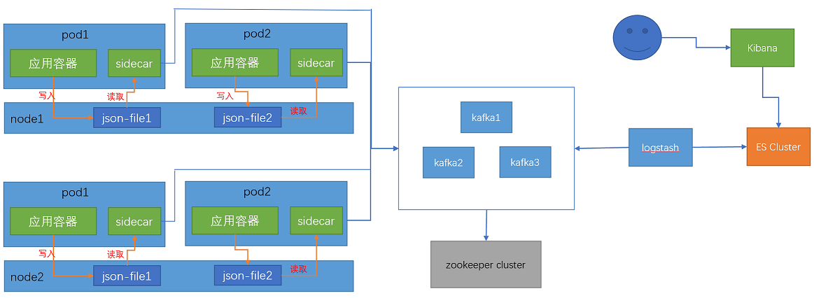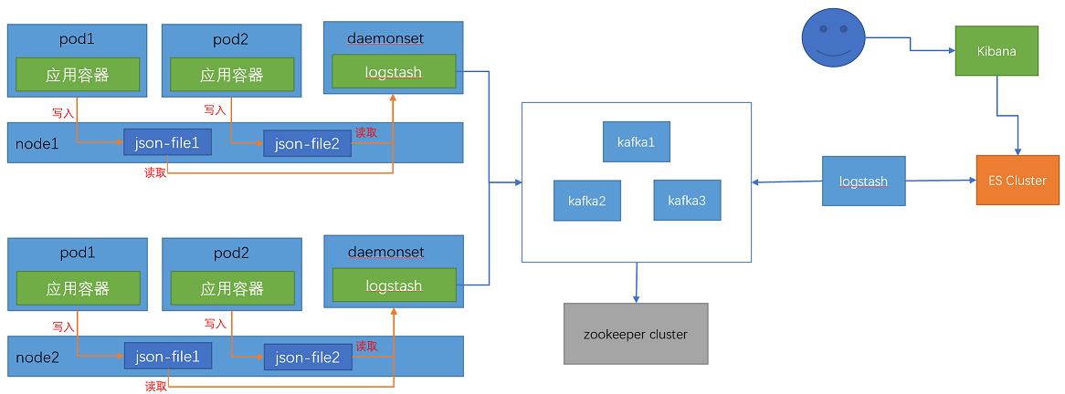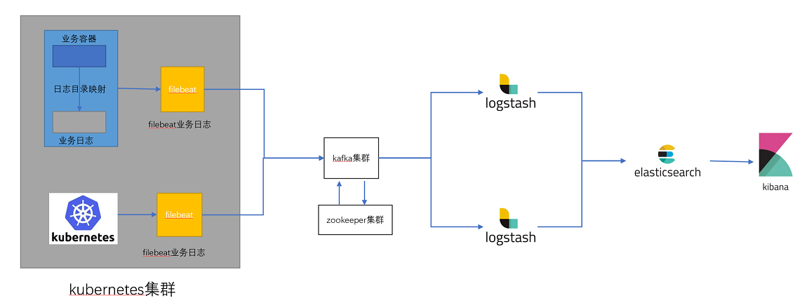 注意:在业务高峰期,k8s集群会产生大量日志,如果日志直接发送给logstash,会占用logstash大量磁盘IO,负载很高,如果logstash无法及时处理,就会产生阻塞造成数据丢失。为了防止此类问题,在中间加上kafka缓存,消息先缓存在kafka中,由kafka投递给logstash进行处理。
