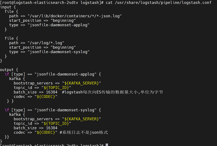 由于使用的同一个容器内进程方式收集日志,且filebeat配置文件中type类型发生变化,用于消费kafka日志的logstash容器中的配置文件也要做出相应的修改,否则将无法消费kafka集群中的日志