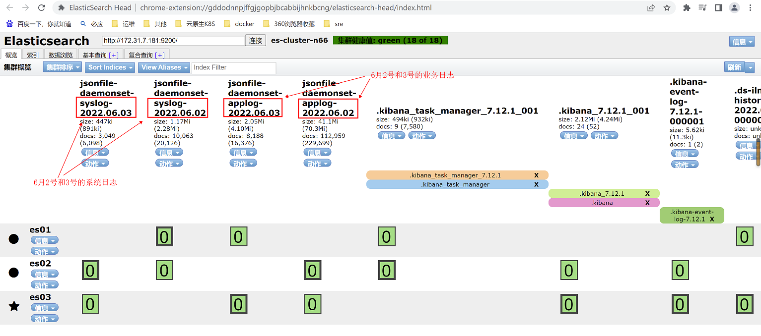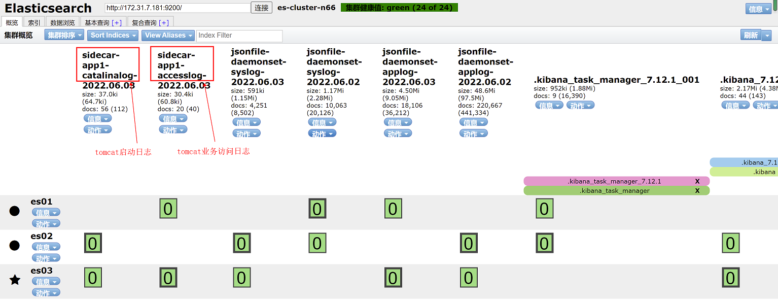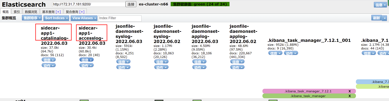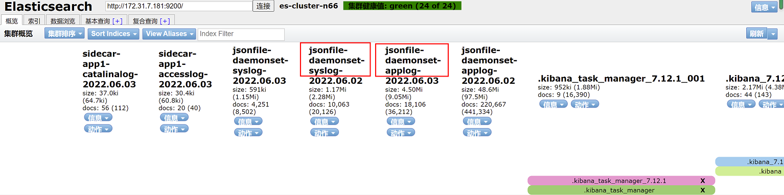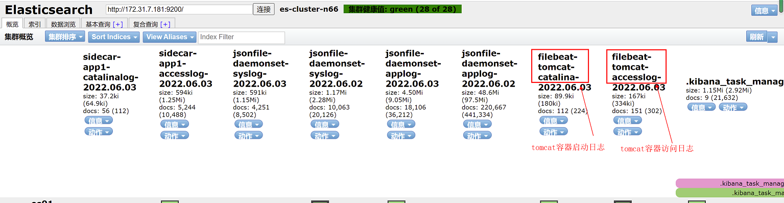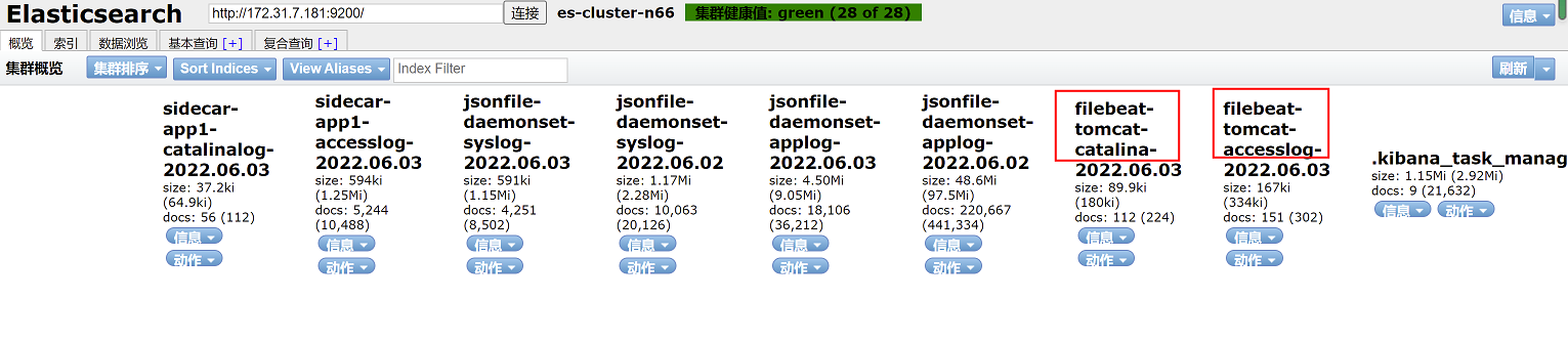 再elasticsearch head页面查看索引名称,红框中索引名称,日志以代替,即filebeat-tomcat-accesslog-和filebeat-tomcat-catalina-*
