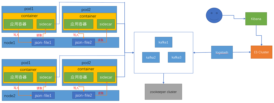 1、在k8s集群内部(node、pod、容器)内置filebeat客户端收集日志(日志主要为业务access日志和kubernetes集群的系统日志)
