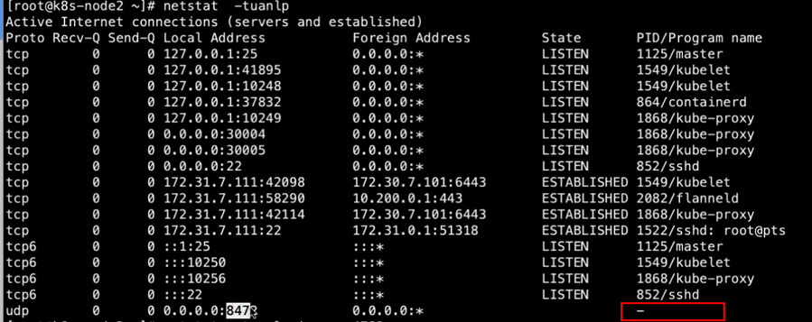 下面截图中,8472端口的进程显示为”-”,这是因为8472端口是内核打开的UDP端口,由内核进行监听,并不是由某个服务进程在监听,用来封装和解封装报文。