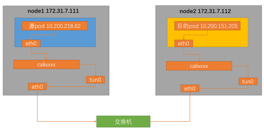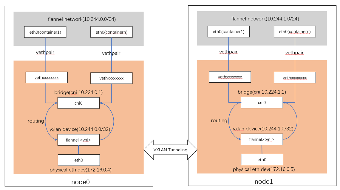 pod(eh0)-->网桥虚拟网卡vethxx-->cni0-flannel.1-->vxlan(内核封装overlay)-eth0(源宿主机,源端口为UDP 随机端口,目的端口为目的主机UDP 8472) -->对端主机eth0(UDP 8472) -->flannel.1-->cni0-->网桥虚拟网卡vethxx-->eth0(pod)
