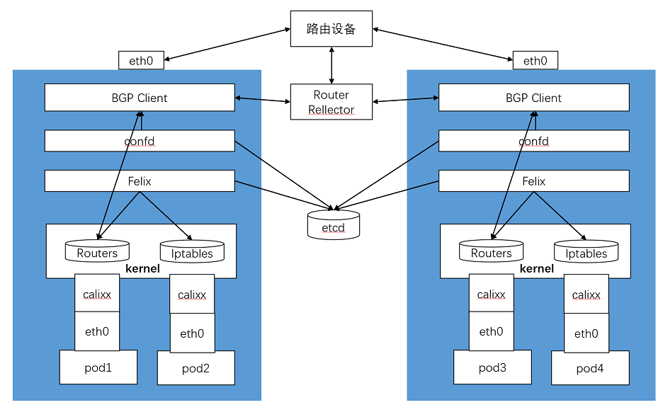 Route Reflector:集中式的路由反射器,calico v3.3开始支持,当calico BGP客户端将路由从其FIB(Forward Information dataBase,转发信息库)通过到Route Reflector时,Route Reflector会将这些路由通告给部署集群中的其他节点,Route Reflector专门用于管理BGP网络路由规则,不会产生pod数据通信。该组件不是必需的,而且是单点,启用后一旦出现问题,k8s集群内的node节点之间将无法通信,因此一般不会启用该组件。