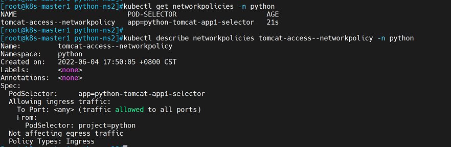yaml文件指定规则为:只能访问pod 标签为python-tomcat-app1-selector的pod,且只能访问目标pod的8080端口(53端口用来做dns解析)