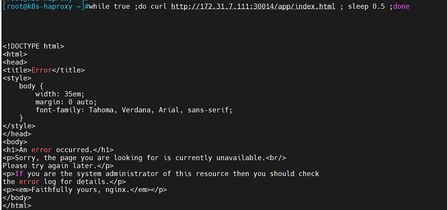 (3)重新加载yaml文件,然后在同namespace下的nginx容器访问tomcat容器进行测试,发现无法正常访问。这是因为nginx地址在网络策略限制范围内,因此无法访问目标pod