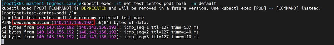 进入测试容器对servicename进行解析,返回地址正是www.magedu.com的公网域名解析地址