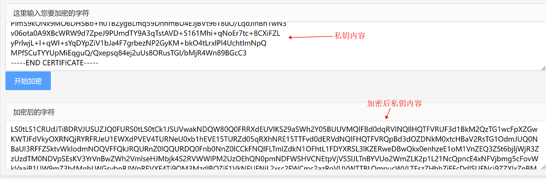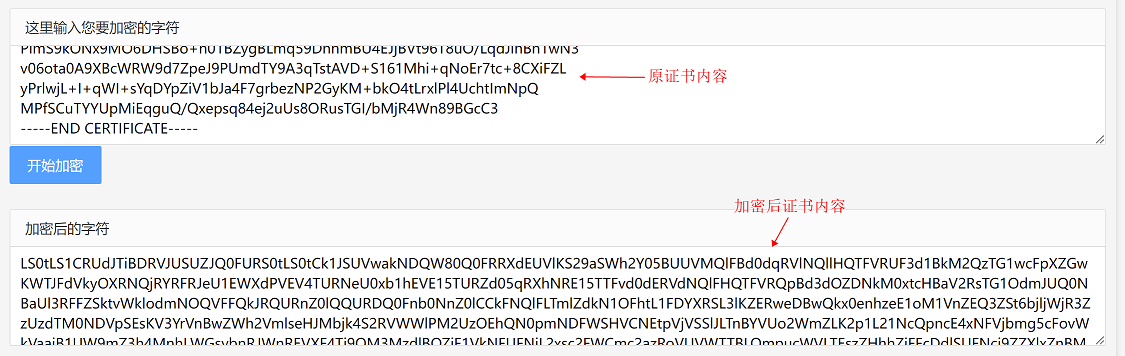 将证书内容(红框内所有内容)复制出来,在互联网找到base64在线加密工具进行base64加密
