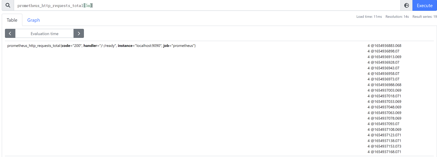 是一组时间序列,每个时间序列包含单个数据样本,比如node_memory_MemFree_bytes查询当前剩余内存就是一个瞬时向量,该表达式的返回值中只会包含该时间序列中的最新的一个样本值,而相应的这样的表达式称之为瞬时向量表达式,例如:prometheus_http_requests_total