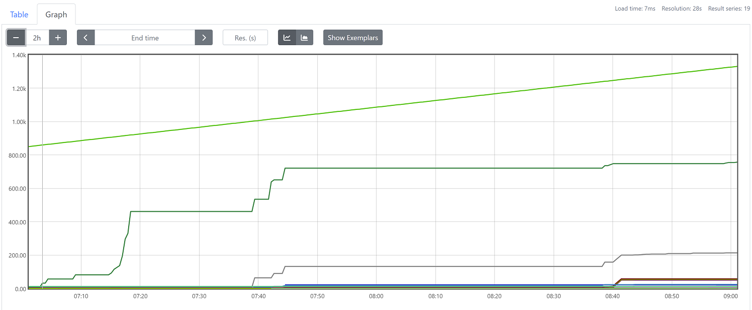 假如每分钟产生一个当前的活跃连接数,那么一天就会产生1440个数据,查看数据的每间隔的绘图跨度为2小时,那么2点的柱状图(bucket)会包含0点到2点即两个小时的数据,而4点的柱状图(bucket)则会包含0点到4点的数据。而6点的柱状图(bucket)则会包含0点到6点的数据。