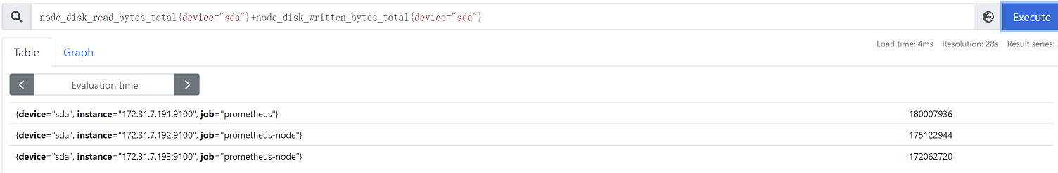 node_disk_read_bytes_total{device="sda"}+node_disk_written_bytes_total{device="sda"} #计算磁盘读写数据量