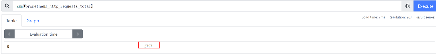 sum(prometheus_http_requests_total){} #下图中2757是指 最近总共请求数为2757次,用于计算返回值的总数(如http请求次数)