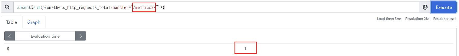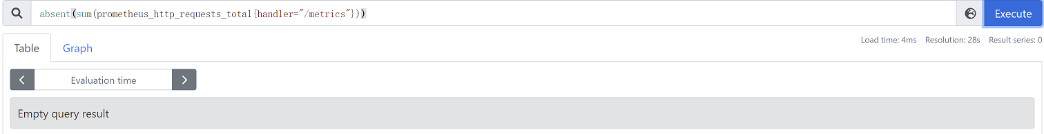 absent(sum(prometheus_http_requests_total{handler="/metrics"})) #返回为空,说明有数据