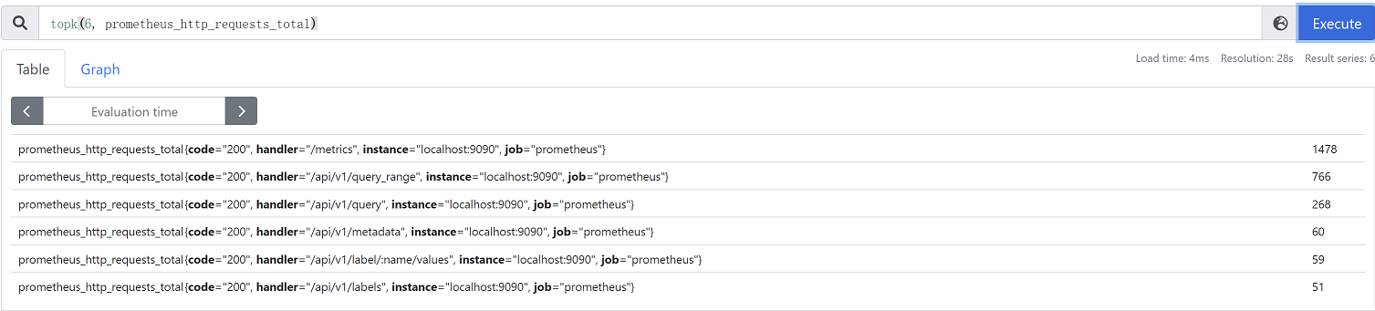 topk(6, prometheus_http_requests_total) #取从大到小的前6个