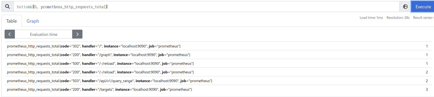 bottomk(6, prometheus_http_requests_total) #取从小到大的前6个