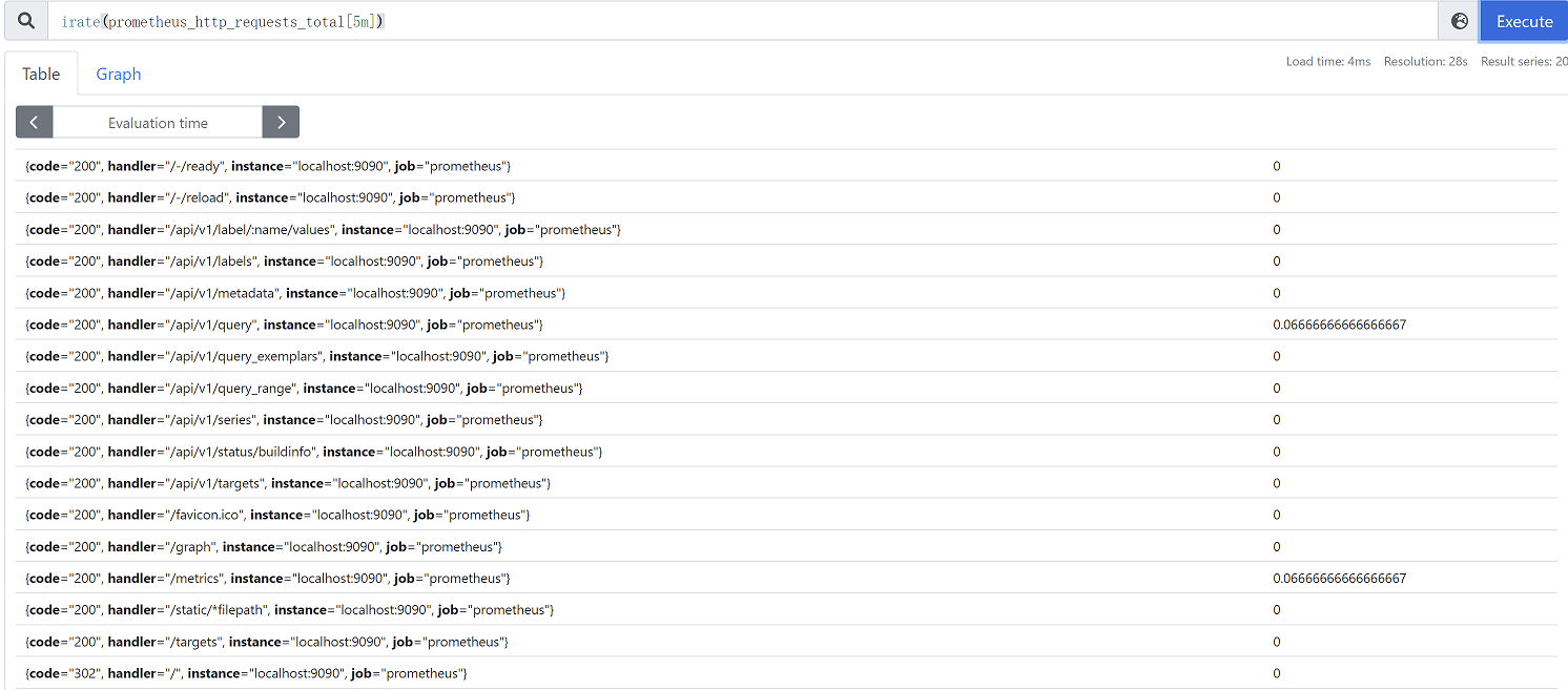 rate(prometheus_http_requests_total[5m]) #取出5分钟的数据,计算每秒的平均数