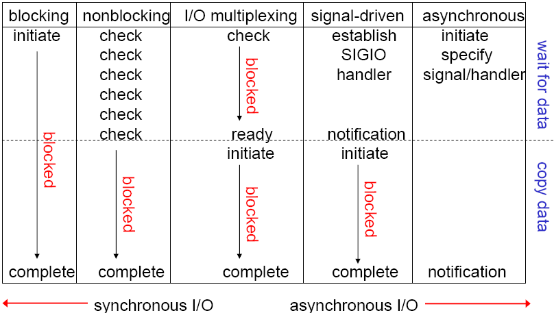 阻塞型、非阻塞型、复用型、信号驱动型、异步