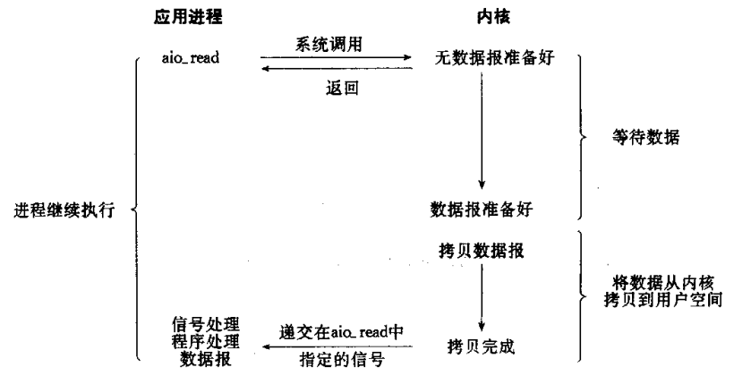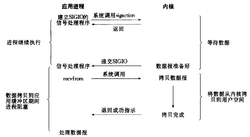 • 此模型的优势在于等待数据报到达期间进程不被阻塞。用户主程序可以继续执行,只要等待来自信号处理函数的通知