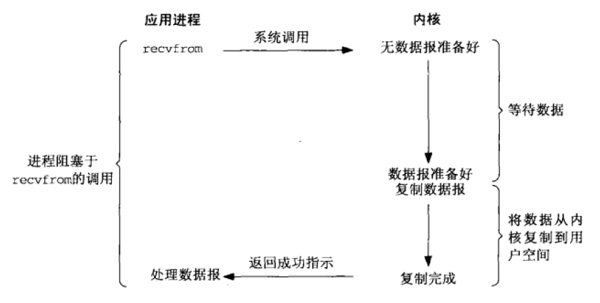 • 用户线程通过系统调用read发起IO读操作,由用户空间转到内核空间。内核等到数据包到达后,然后将接收的数据拷贝到用户空间,完成read操作