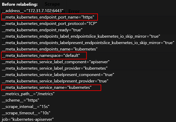 prometheus 从 Kubernetes API 动态发现目标(targer)之后,在被发现的 target 实例中,都包含一些原始的Metadata 标签信息(这些信息是k8s集群内置的、自带的元数据标签),默认的标签有: