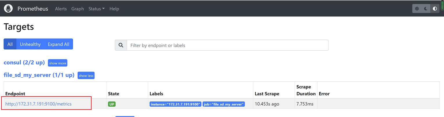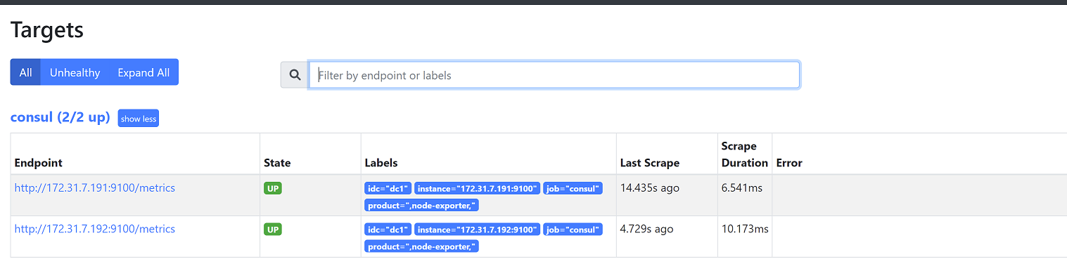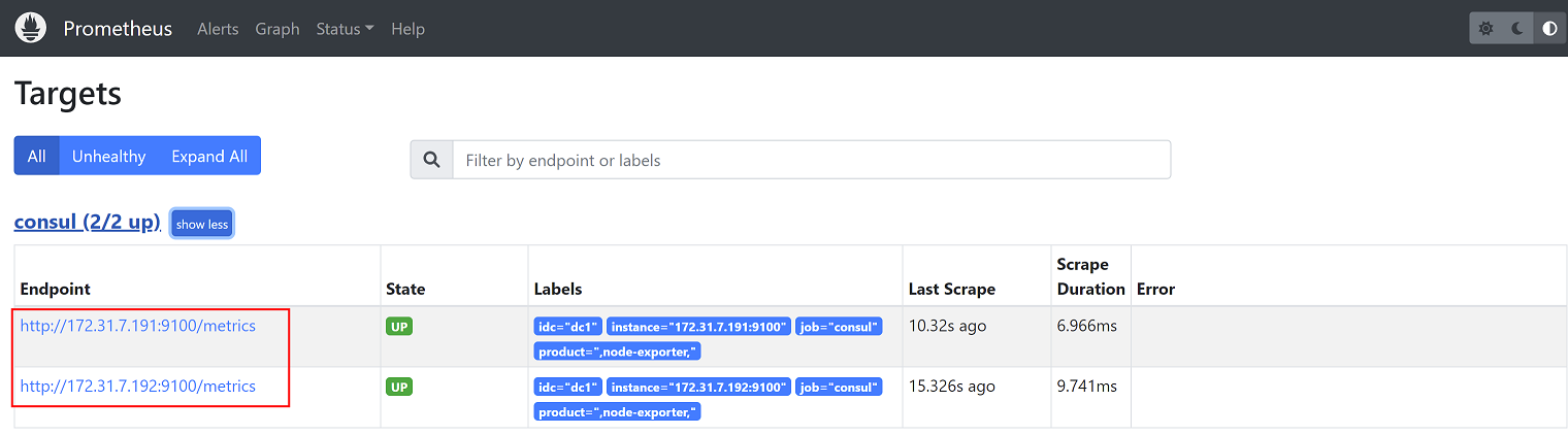 查看Prometheus监控页面,已经获取到两台注册到consul的主机