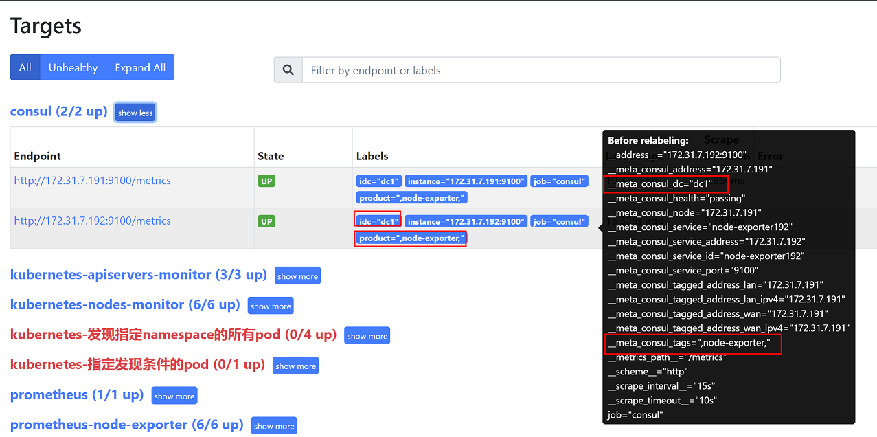 regex: '(.*):10250'    #通过正则表达式进行匹配, (.*)是指ip地址为任意ip地址,端口为10250
