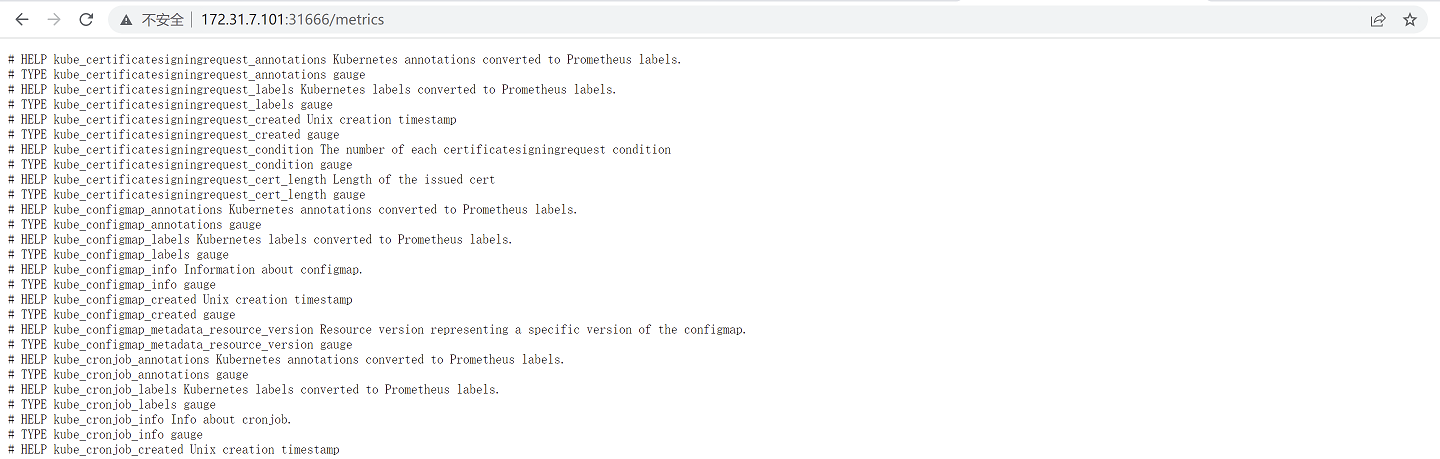 通过监听API Server生成有关资源对象的状态指标,比如Deployment、Node、Pod,需要注意的是kube-state-metrics的使用常见不是用于监控对方是否存活,而是用于周期性获取目标对象的metrics指标数据并在web界面进行显示或被prometheus抓取(如pod的状态是running还是Terminating、pod的创建时间等)。目前的kube-state-metrics收集的指标数据可参考官方的文档:https://github.com/kubernetes/kube-state-metrics/tree/master/docs